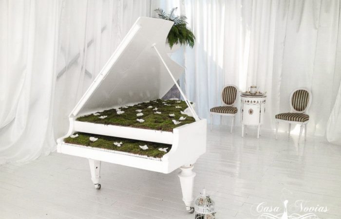Un avantaj al acestei locatii este si butaforia pe care o pune la dispozitie mirilor pentru a-si crea decorul dorit. Mirii nostri au optat pentru un pian alb, pe care l-am decorat in acelasi stil elegant cu un pat de muschi inflorit cu phalaenopsis.